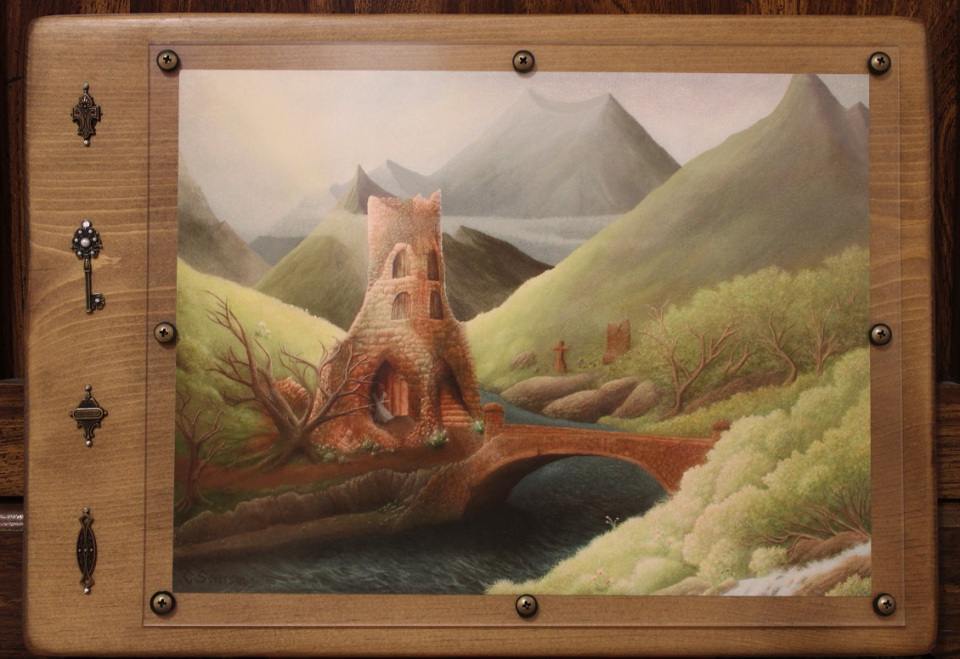 Archival-quality giclée prints are mounted on house-made wood plaques. The wood plaques are cut to size; hand-sanded at a progressively finer grit; and then pre-stained, stained, and varnished to create a smooth, rich finish. Finally, the plaque-mounted prints are optionally bordered with ornamental chains or other decorations. Examples are shown below.