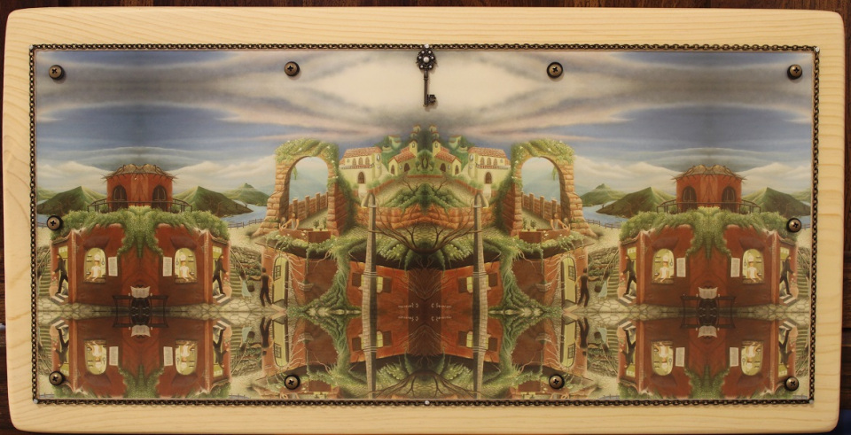 Archival-quality giclée prints are mounted on house-made wood plaques. The wood plaques are cut to size; hand-sanded at a progressively finer grit; and then pre-stained, stained, and varnished to create a smooth, rich finish. Finally, the plaque-mounted prints are optionally bordered with ornamental chains or other decorations. Examples are shown below.